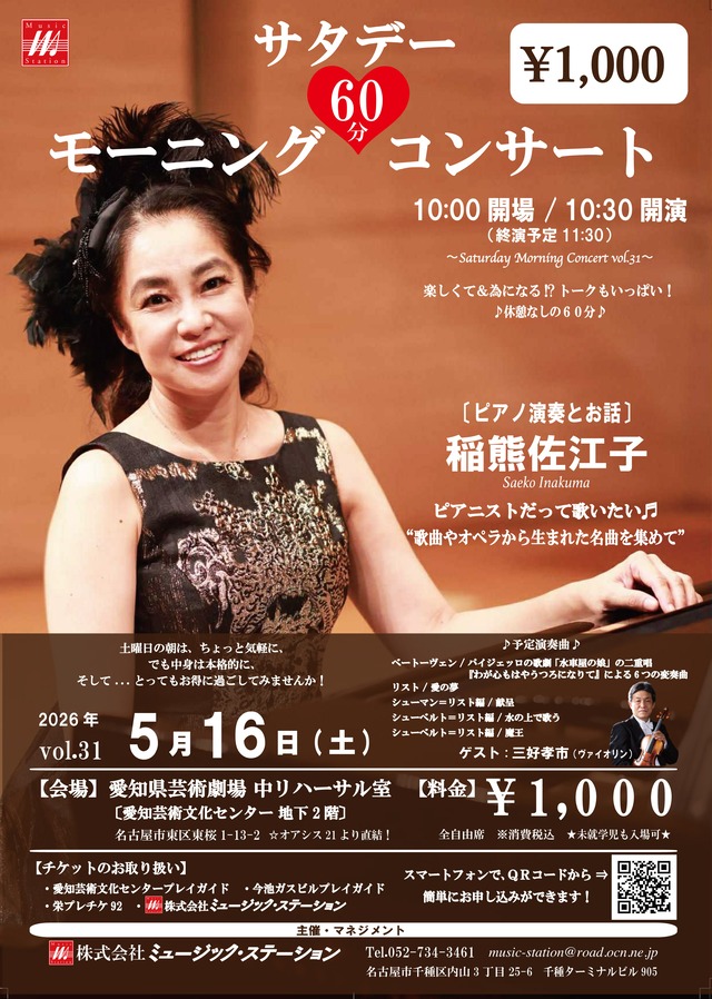 サタデー・モーニング・コンサート vol.31 〜土曜日の朝、ピアニスト「稲熊佐江子」さんと共に過ごすクラシカルタイム〜 トーク付き60分、1,000円で楽しむコンサート。 土曜の朝は、ちょっと気軽に、でも中身は本格的に、そしてお値打ちに過ごしてみては!? ピアニストだって歌いたい♬ …歌曲やオペラから生まれた名曲を集めて… 【日時】2026年5月16日(土) 10:00開場/10:30開演 休憩なし、約60分のプログラムです。 【出演】 稲熊 佐江子(ピアノ演奏とお話) ゲスト:三好 孝市(ヴァイオリン) 【プログラム】 ベートーヴェン / パイジェッロの歌劇 「水車屋の娘」の二重唱 『わが心もはやうつろになりて』による6つの変奏曲 リスト / 愛の夢 シューマン=リスト編 / 献呈 シューベルト=リスト編 / 水の上で歌う シューベルト==リスト編 / 魔王 ////////////////////////////////////////////////// ☆楽しくて為になる!? トークもいっぱい! ♪休憩なしの60分♪ ////////////////////////////////////////////////// 【会場】愛知県芸術劇場 中リハーサル室 住所:名古屋市東区東桜1-13-2 ☆オアシス21より直結! 【料金】全自由席 ¥1,000 ※消費税込 ☆未就学児入場可(チケットは必要です) ※チケットご購入後のキャンセル、ご返金はできません(公演が延期、中止となった場合を除きます)。 【主催&マネジメント】株式会社ミュージック・ステーション Tel.052-734-3461 [email protected] [営業時間]11:00〜18:00(水・日定休) 名古屋市千種区内山3丁目25-6 千種ターミナルビル905 (JR&地下鉄「千種」駅④番出口より徒歩1分) https://www.facebook.com/MS.Hall.and.Gallery/