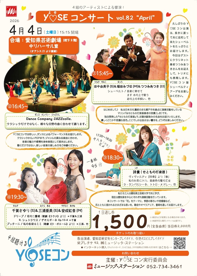 詳細は近日発表! Y♡SEコン vol.82 “April” ①15:45~16:30 ②16:45~17:30 〜 中入り 〜(17:30〜18:30) ③18:30~19:15 ④19:30〜 20:15 【日時】①2026年4月4日(土) 15:15開場/15:45開演 ②2026年4月4日(土) 16:30開場/16:45開演 〜 中入り 〜(17:30〜18:30) ③2026年4月4日(土) 18:00開場/18:30開演 ④2026年4月4日(土) 19:15開場/19:30開演 【会場】愛知県芸術劇場B2 中リハーサル室 住所:名古屋市東区東桜1-13-2 ☆オアシス21より直結! 【料金】1日通し券 全自由席 前売 ¥1,500 当日 ¥2,000 ★チケット1枚で、4組全ての公演が聴けます! ☆曲目等は変更となる場合がございます。あらかじめご了承ください。 ☆未就学児入場可(チケットは必要です) ※チケットご購入後のキャンセル、ご返金はできません(公演が延期、中止となった場合を除きます)。 【主催】Y♡SEコン実行委員会 【マネジメント&お問い合わせ】株式会社ミュージック・ステーション Tel.052-734-3461[営業時間]11:00〜18:00(水・日定休) 愛知県名古屋市千種区内山3丁目25-6 千種ターミナルビル 905 (JR&地下鉄「千種」駅④番出口より徒歩1分) https://www.facebook.com/MS.Hall.and.Gallery