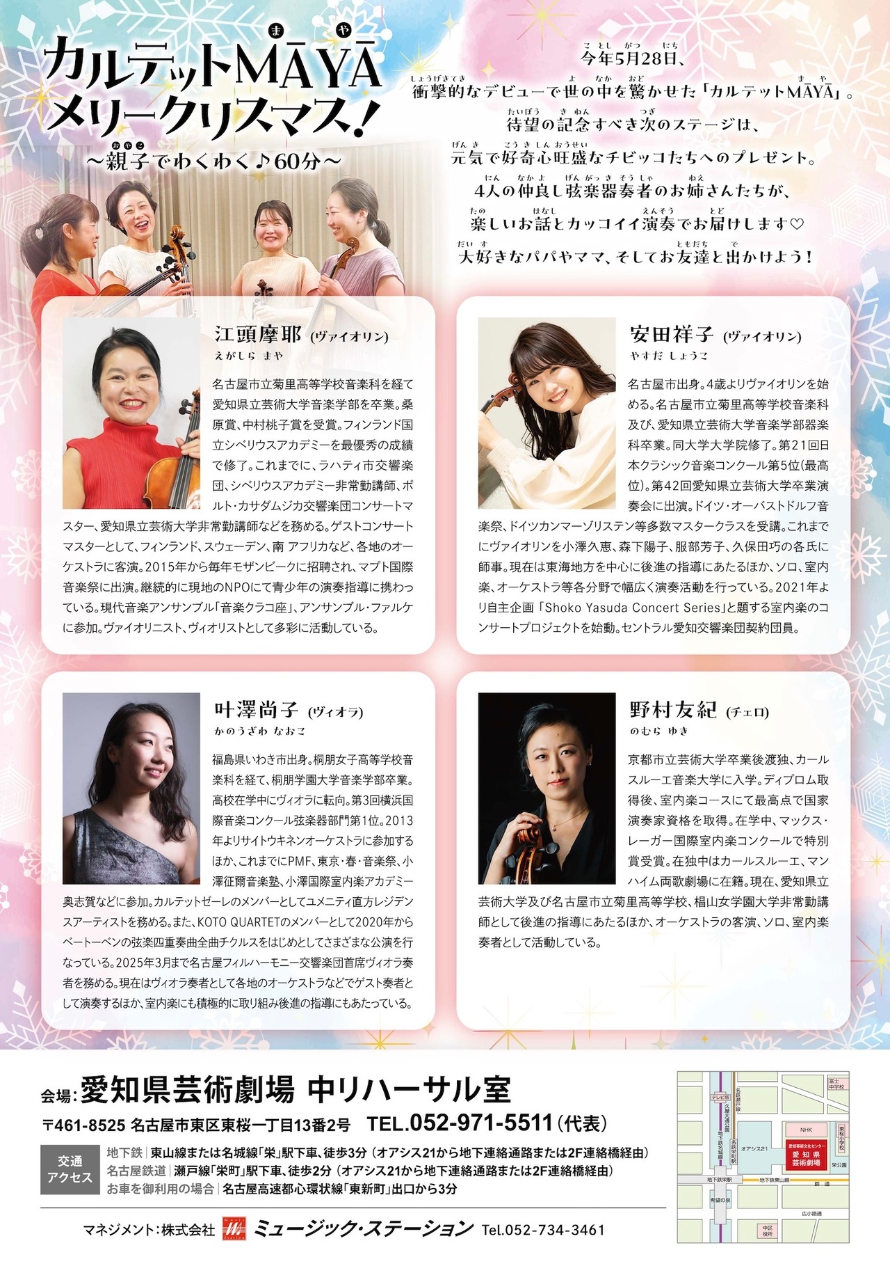 ♡おとな1枚+こども2枚 セット券♡ 2025年12月23日(火) カルテットMĀYĀ ♡メリークリスマス!― 親子でわくわく♪60分―@愛知県芸術劇場 中リハーサル室 | Music Station