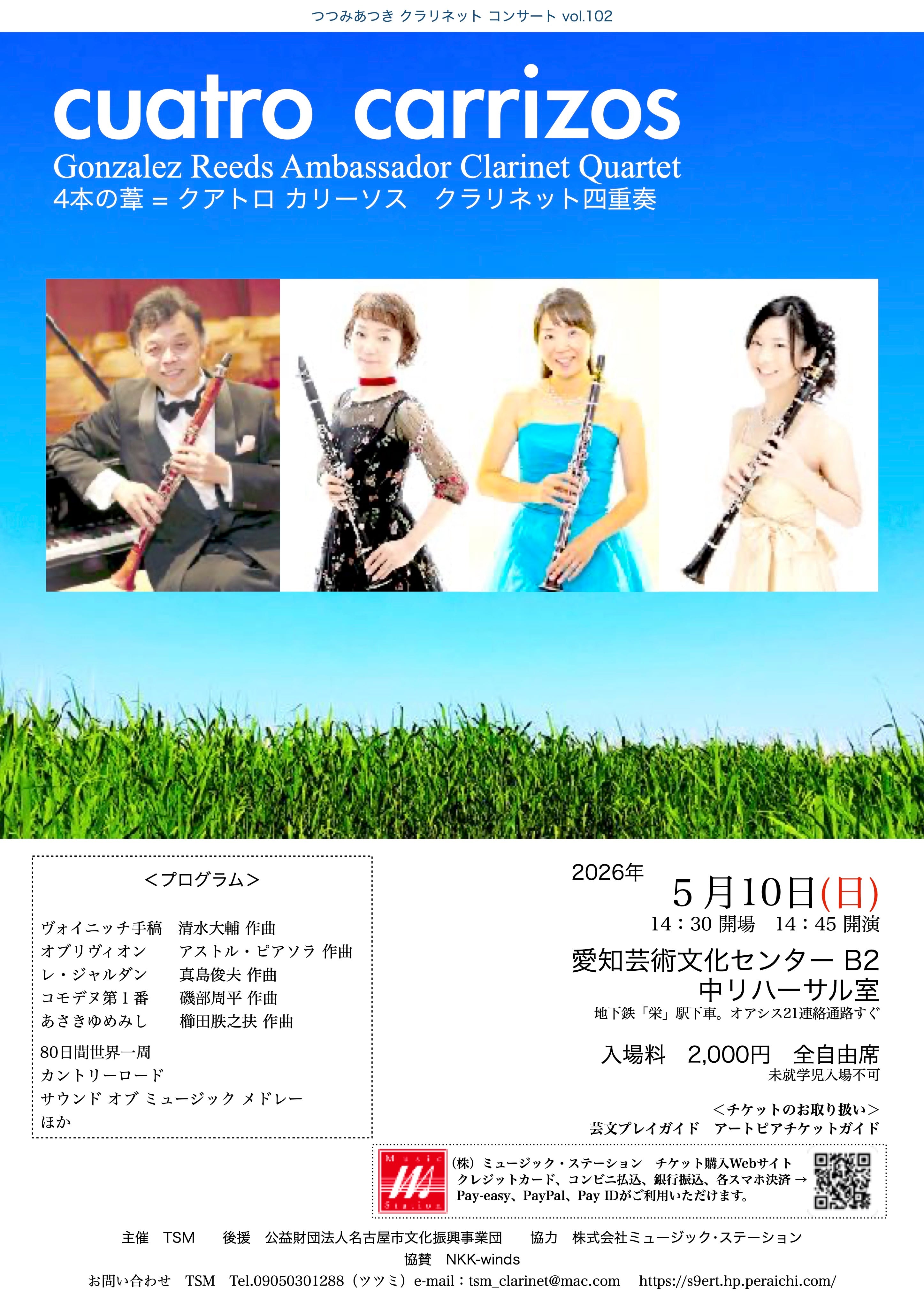 2026年5月10日(日) つつみあつき クラリネット コンサート vol.102《4本の葦 = クアトロ カリーソス クラリネット四重奏》@愛知県芸術劇場 中リハーサル室